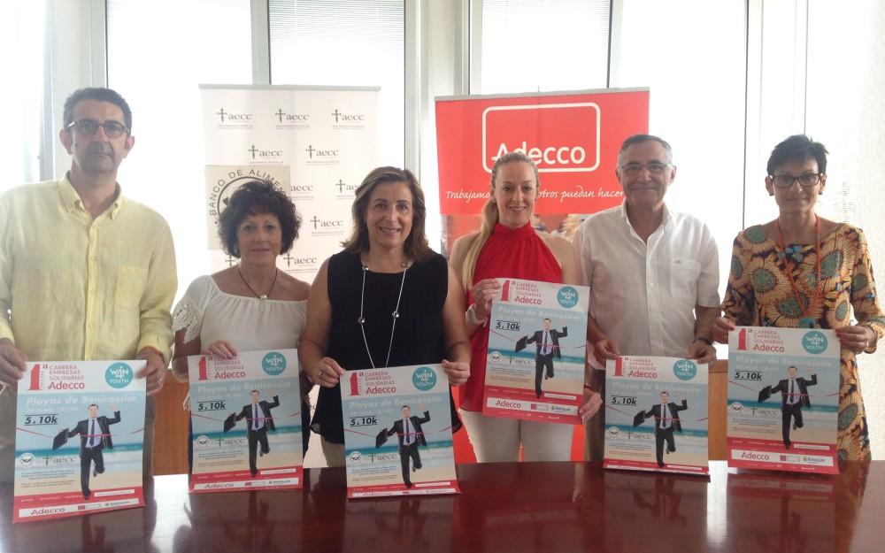 La alcaldesa de Benicàssim, Susana Marqués y el concejal de deportes, Javier Alonso, junto a Pilar Trilles directora de la delegación de Castellón de Adecco, Salomé Esteller, coordinadora provincial de la Asociación contra el Cáncer y Luis Prada, presidente del Banco de Alimentos de Castellón, han presentado esta mañana la primera carrera de empresas solidarias impulsada por Adecco a beneficio de las dos ONGs antes citadas y del proyecto Win 4 youth de Adecco para el apoyo a iniciativas de trabajo con jóvenes desfavorecidos. La carera ademas, cuenta con el apoyo de la Diputación de Castellón.