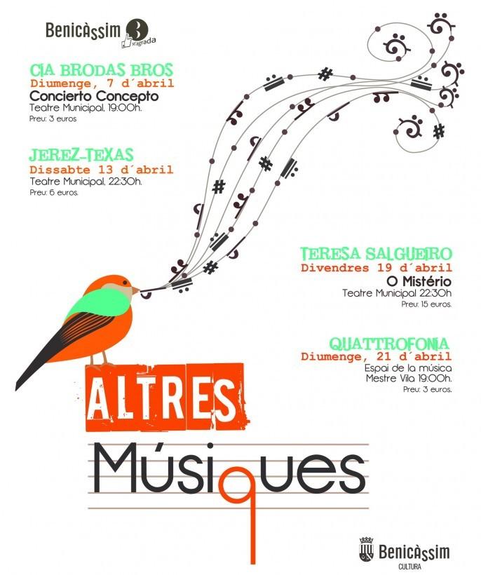 El ayuntamiento de Benicàssim, a través del Área de Cultura pone en marcha este próximo 6 de abril el nuevo el Ciclo Altres Músiques para los fines de semana de abril, propuesta que entrará a formar parte del conjunto de Festivales que Benicàssim ofrece a lo largo del año.