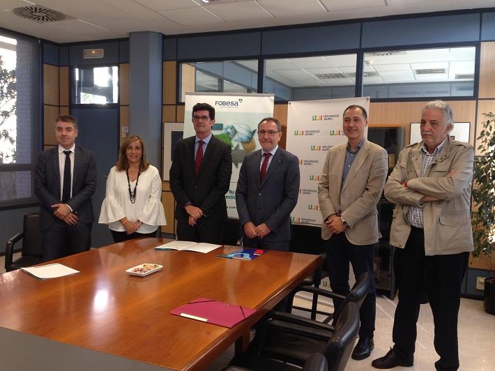 El rector de la Universitat Jaume I, Vicent Climent, y el presidente de Grupo Gimeno, Enrique Gimeno, han firmado esta mañana un convenio de colaboración por la renovación de las becas Fobesa para la estudiantat de grado de la UJI residente en Benicàssim. Durante la firma del acuerdo también han estado presentes la alcaldesa de Benicàssim, Susana Marqués, el vicerrector de Economía y PAS, Miguel Ángel Moliner; el gerente de la Fundación General, José Francisco Vicente, y el director de Fobesa, Juan Pablo Mateo.