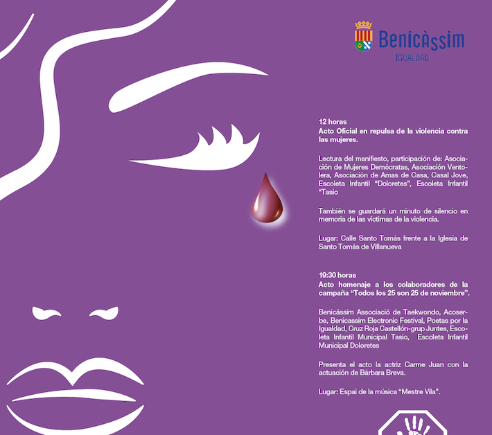 El Ayuntamiento de Benicàssim ha planificado una jornada intensa para denunciar la lacra de la violencia de género en el Día Internacional contra la violencia contra las mujeres que se celebrará el próximo sábado 25 de noviembre. La concejala de igualdad, Vanessa Batalla ha informado que “este año, vamos a convertir este día en una fecha aún más especial puesto que queremos visibilizar la implicación y participación de las entidades sociales en la lucha contra la violencia en nuestro municipio. Hemos emprendido un camino para combatir estas acciones violentas que no tiene vuelta atrás, y somos conscientes de que lo debemos abordar entre todos y todas, porque es la única manera de aislar a los maltratadores y apoyar a las víctimas y a las mujeres resilientes”.
