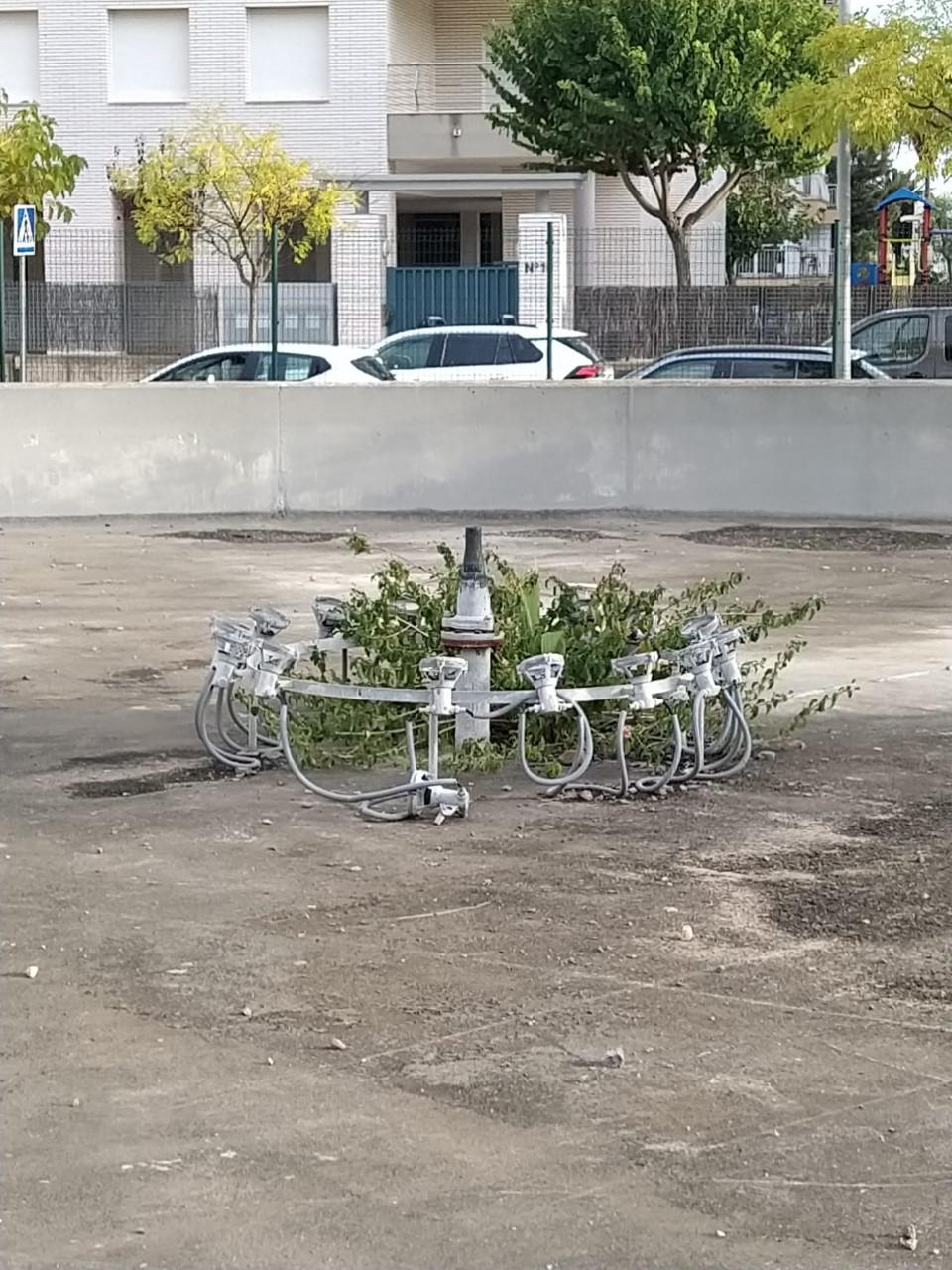 Otro aspecto a resaltar es la distribución de los aspersores, pues algunos de ellos descargan el agua de riego sobre las puertas de chapa que protegen las bombas, y por la ranura de cierre se filtra el agua, que cae sobre ellas, provocando la oxidación de las mismas. Por tanto, una fuente preciosa que no está en funcionamiento, por una defectuosa construcción y por tener unas bombas llenas de herrumbre. El otro ornamento que no funciona es la cascada de agua, unas veces porque los desalmados roban la bomba de agua y otras porque no se arregla dicha bomba. En resumen, hay dos piezas claves de la plaza que no están en funcionamiento.