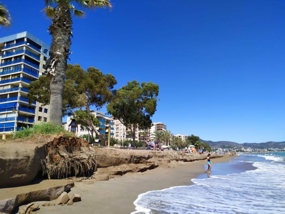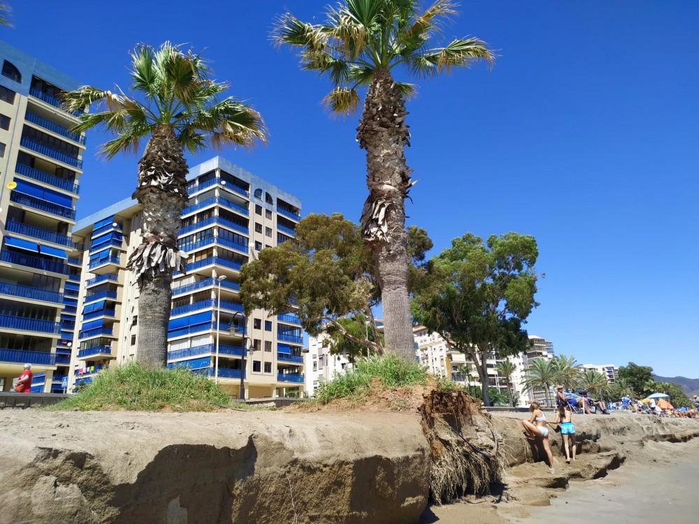 De hecho, este fin de semana y tras las lluvias del sábado, en esta playa el escalón estaba mucho más pronunciado, tanto es así, que hasta se podían ver las raíces de las palmeras que se encuentran en esta parte de los arenales. También se podía ver que el paso subterráneo desde la playa hacia los apartamentos se encontraba totalmente inundado.