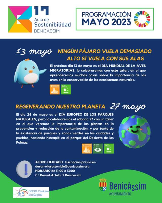 El Aula de Sostenibilidad y Educación Ambiental de Benicàssim es un punto de encuentro al servicio de los vecinos de Benicàssim donde se centralizan las acciones formativas, educativas y de sensibilización en materia de sostenibilidad durante todo el año. Durante el mes de mayo se celebrarán el día Mundial de las aves migratorias y el Día Europeo de los Parques Naturales con actividades para toda la familia.