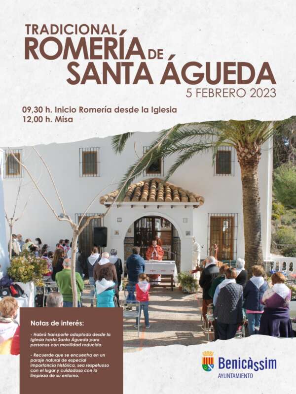 Este año se retoma la tradicional parada en la calle Santa Águeda, lugar donde los romeros harán parada y se procederá al reparto de dulces y moscatel. La romería contará con la asistencia de las reinas de las fiestas, Andrea Pérez y Marta Vicente, y los festeros y festeras. Los participantes ascenderán unos tres kilómetros hasta la ermita, ubicada en la partida Jovellús y al mediodía se oficiará una misa de campo en homenaje a la patrona. Tras los actos religiosos, comenzará el descenso hasta el casco urbano de Benicàssim. Desde el equipo de gobierno agradecen a Don Joaquín Monfort su predisposición con la ciudadanía de Benicàssim para que, como es tradicional, se pueda realizar esta celebración en este emblemático lugar.
