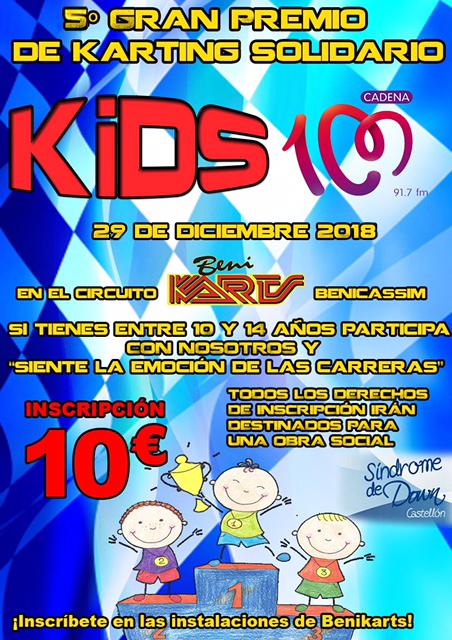 El circuito BeniKarts de Benicàssim acogerá este sábado, 29 de diciembre, el V Gran Premio Solidario “Karting Kids de Cadena 100” dirigido a niños y niñas de entre 10 y 14 años de edad. La recaudación del evento se donará a la Asociación de Síndrome de Down de Castellón.