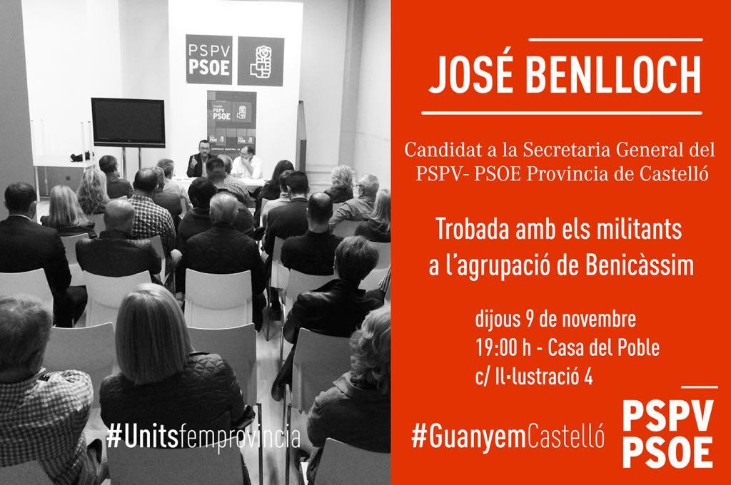 El candidato a la secretaría general del PSPV-PSOE de Castellón José Benlloch ha participado esta tarde en un encuentro con militantes en la agrupación socialista de Benicàssim, en el que ha trasladado a los asistentes la necesidad de alcanzar “un pacto intergeneracional” entre los socialistas en el que 'todos sumemos' con el objetivo último de “guanyar Castelló” y recuperar la representación en las instituciones.