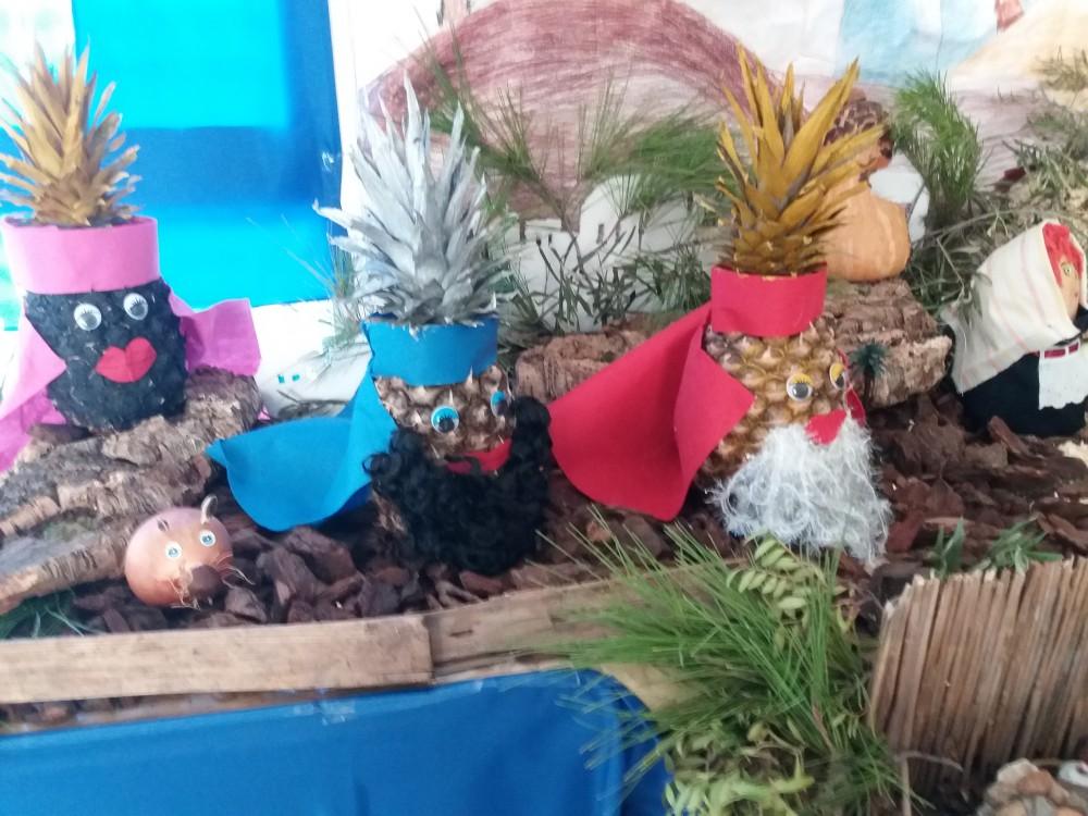 El Betlem és molt 'saludable' i està fet de peces vegetals. Creïlles, Coliflors, Carlotes, Pipes, Roses de dacsa, Pinyes, ... En resum, tot un conjunt d'originalitat que les famílies de l'alumnat de l'escola han aportat.