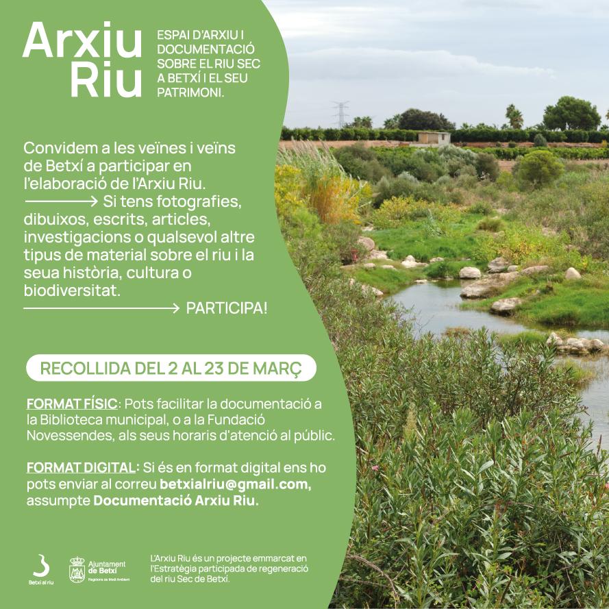 El Arxiu Riu es proposa com a eina per a recollir i custodiar tot tipus d'informació, publicacions i estudis que es realitzen sobre aquest rierol. La iniciativa aspira a generar també un arxiu fotogràfic i de memòria oral, mitjançant entrevistes i tallers intergeneracionals.
