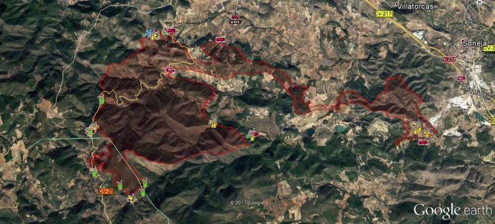 A las 23:00 horas el informe del Puesto de Mando indicaba que el incendio seguía activo, en situación 1. El mismo informe apuntaba que no había riesgo para los núcleos urbanos, aunque se apuntaba que se había tomado la precaución de desalojar varias granjas del tçermino de Soneja.