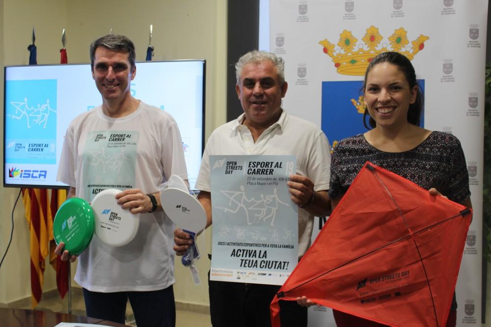 El regidor d'Esports, Vicent Aparisi, amb la regidora d'Igualtat, Maria Romero, i el tècnic del Servei Municipal d'Esport (SME), José Socarrades, han presentat el Projecte Esport al Carrer 'Open Streets Day' que se celebrarà el diumenge 22 de setembre de 10h a 13h, organitzat per l’SME.