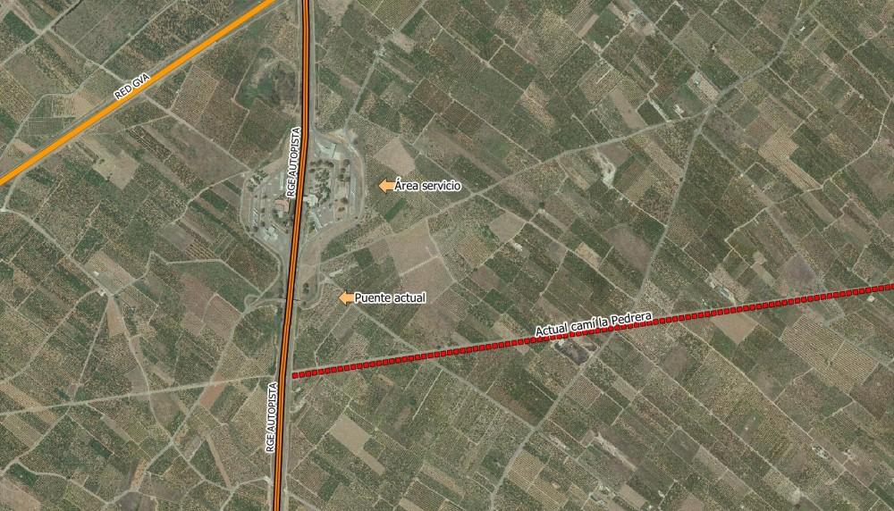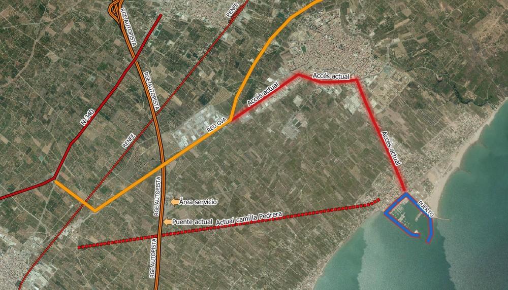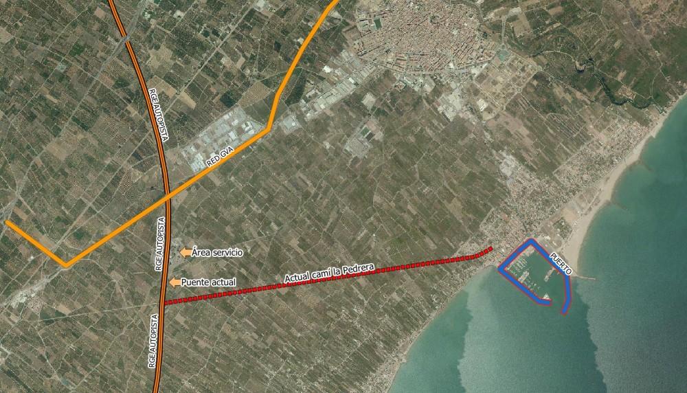 Entre les possibilitats ha assenyalat el camí de la Pedrera, que seria suficient per a un vial convencional amb carrils de 3,5m i vorals de 1,5m. I en arribar a la zona urbana del Port connecta amb l'eix de Descobridors- Av. Canyada Blanch, que enllaçaria directament amb el Grau.