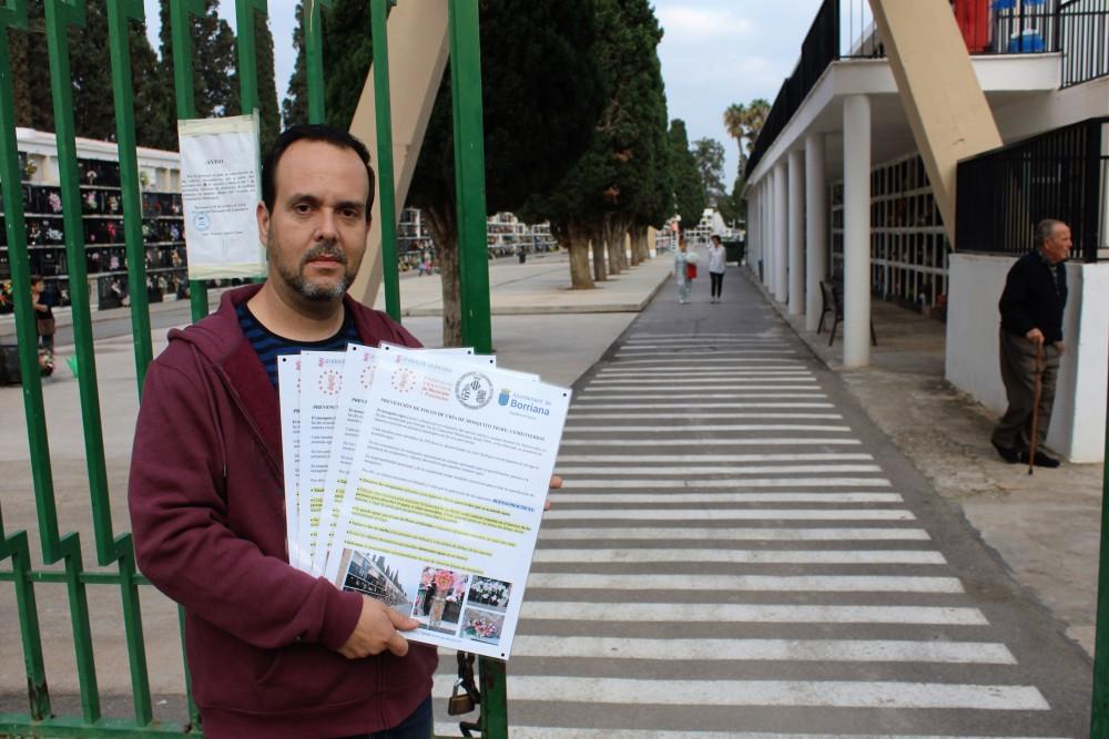 El concejal de Sanidad del Ayuntamiento de Borriana, Manel Navarro, ha visitado el cementerio municipal para instalar toda una un serie de carteles informativos en los que se dan algunos consejos a los centenares de vecinos y vecinas que en las próximas 24 horas pasarán por el cementerio municipal. Tal y como ha explicado el mismo Navarro “se trata de las recomendaciones que tanto la Federación de Municipios como la misma Consellería han hecho llegar a los departamentos de Sanidad municipales para seguir previniendo la presencia de mosquitos, y sobretodo, evitar la creación de posibles focos de reproducción que se pueden dar en un lugar como el cementerio municipal”. Según ha detallado, “las temperaturas de todo el mes de octubre nos obligan a seguir muy pendientes de la proliferación de esta especie en nuestro término municipal, y si queremos mantener los mismos niveles de control que hemos disfrutado durante todo el verano, no podemos bajar la guardia”. En los carteles informativos repartidos por las diferentes estancias del camposanto, se dan hasta cinco consejos básicos para evitar que la renovación en la decoración de las lápidas o la acumulación de agua en los mismos recipientes donde se colocan las flores, no suponga un riesgo de proliferación y cría de mosquitos tigre. Además, Navarro ha querido “recordar a la gente con segundas residencias en la zona marítima que los buenos resultados por lo que a la afección de los mosquitos respecta del pasado verano, solo se mantendrán si como hasta ahora, la ciudadanía sigue colaborando en tener cuidado con posibles aguas estancadas o manteniendo los tratamientos que tan bien han funcionado en piscinas, fuentes o posibles lugares de acumulación de agua estancada”.