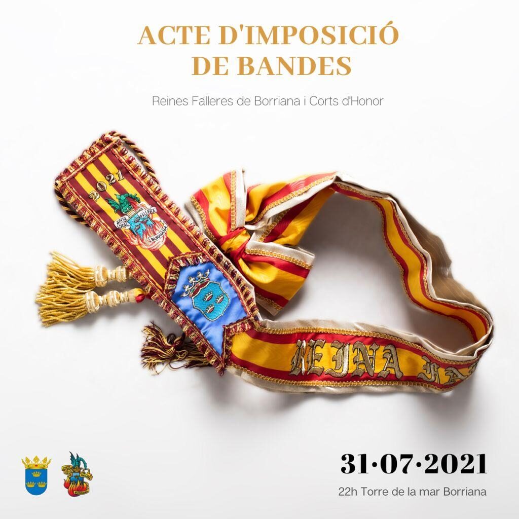 La regidora de Falles i presidenta de la Junta Local Fallera, Sara Molina, ha assenyalat que enguany, com a novetat, només s'imposaran les bandes a les reines falleres de Borriana i no a totes les falleres majors de la ciutat, per la situació de covid i l'aforament del recinte a l'aire lliure, que estarà limitat a 300 persones, assegudes i mantenint la distància de seguretat i protocols contra la covid.