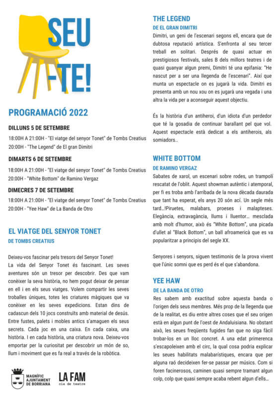 El festival d'arts escèniques Seu-te repetirà per tercer any consecutiu a Borriana, per a tornar a omplir la plaça Josep Iturbi de teatre i dansa amb obres de companyies locals i de la Comunitat Valenciana.