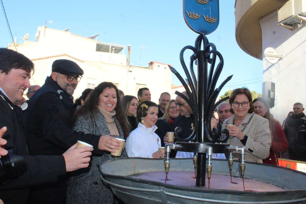 L'alcaldessa, Maria Josep Safont, la regidora de Festes, Lluïsa Monferrer, i les reines falleres, Silvia Navarro i Maria Olivas, han sigut les primeres a acostar-se fins a la Font del vi per a, posteriorment, arreplegar l'esmorzar que les corts d'honor han oferit a totes les persones que han participat en l'acte.