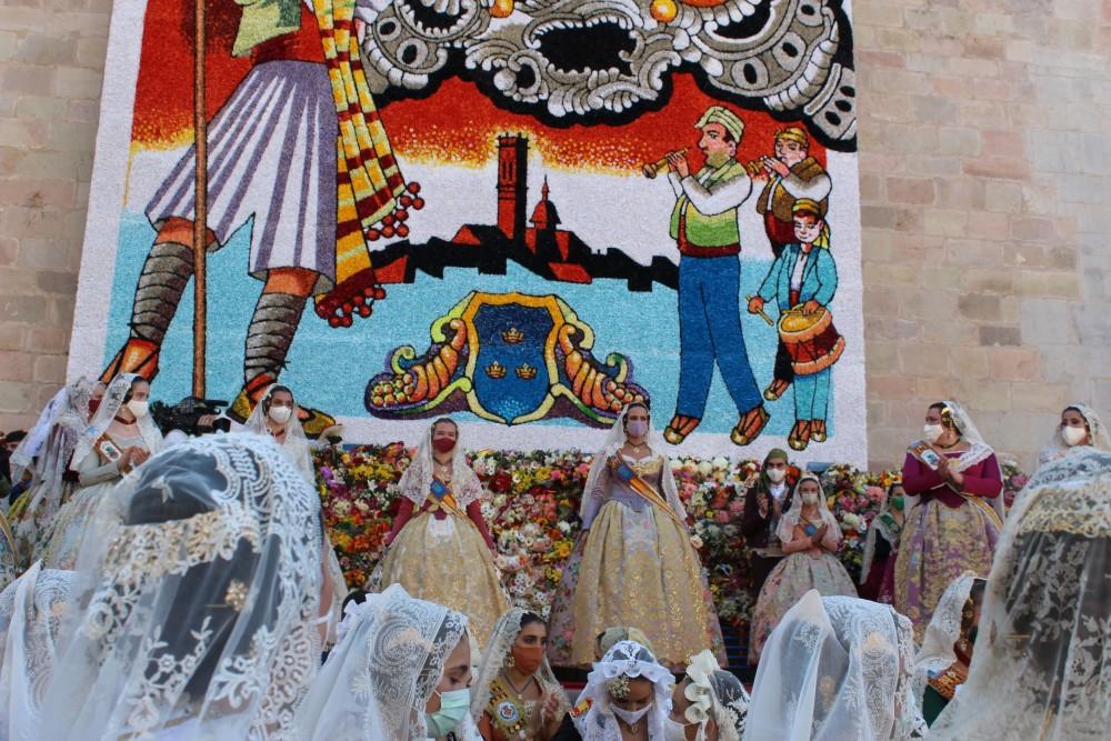 Les 19 comissions falleres de la ciutat s'han donat cita al voltant del col·legi Salesià, des d’on s’ha iniciat la desfilada pels carrers principals de la ciutat fins a arribar a la plaça Major. Una darrere de l’altra, escalonadament, han anat accedint a l’escenari i han depositat les seues flors com a ofrena a la patrona de la ciutat, la Mare de Déu de la Misericòrdia, sota el tapís en la façana de la basílica d’El Salvador.