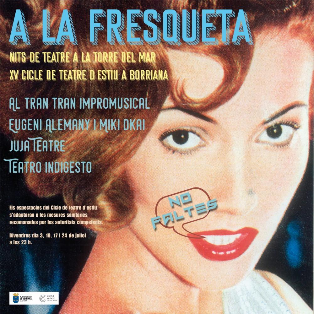 Amb l'arribada de l'estiu, l'Ajuntament de Borriana presenta una nova edició d’A la fresqueta. Nits de teatre a la Torre de la Mar, que comptarà per a l'edició 2020 amb quatre espectacles totalment gratuïts, que podran gaudir-se, com és habitual, a la Torre de la Mar els divendres del mes de juliol a les 23h.