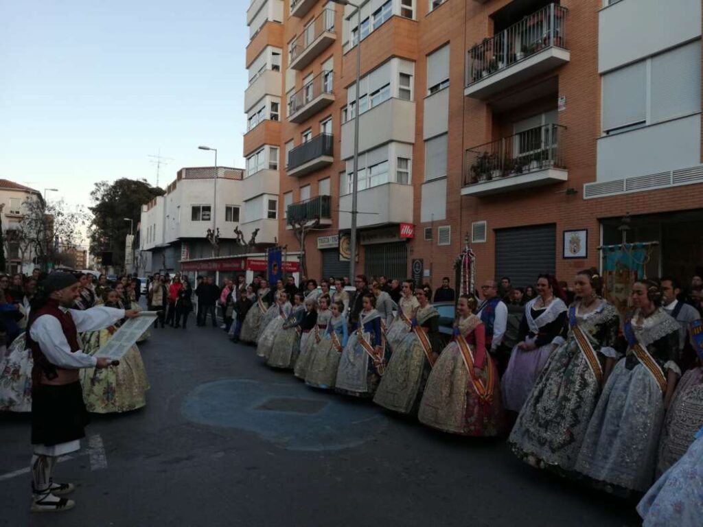 Desde las seis de la tarde, la comitiva oficial encabezada por la concejala de Fallas y presidenta de la Junta Local Fallera, Sara Molina, han recogido a las Reinas Falleras, Silvia Navarro y María Olivas, y se han ido incorporando progresivamente cada una de las 18 agrupaciones falleras de la ciudad al desfile que ha confluido finalmente en la Crida desde el balcón del Ayuntamiento.
