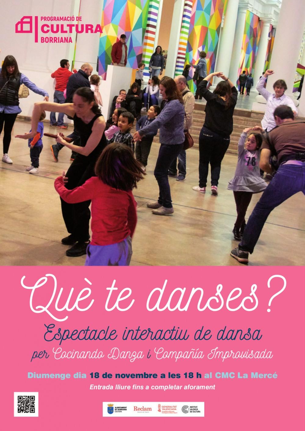 La Regidoria de Cultura, amb la col·laboració de l'Institut Valencià de Cultura i la participació del Reclam 2018, ha programat per al pròxim diumenge dia 18 de novembre a les 18 h al CMC La Mercé, l'espectacle interactiu de dansa 'Què te danses?' amb Henar Fuentetaja i Miguel Tornero de Cocinando Danza i Compañía Improvisada.
