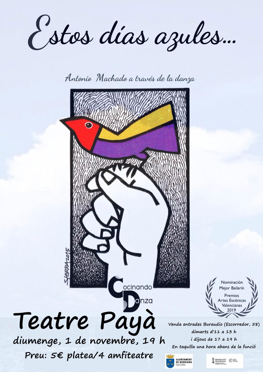L'Ajuntament de Borriana a través de la regidoria de Cultura, i amb la col·laboració de l'Institut Valencià de Cultura i la participació de Reclam 2020, ha programat l'espectacle interactiu de dansa Estos días azules..., una aproximació a Antonio Machado a través de la dansa, amb Henar Fuentetaja i Miguel Tornero de CocinandoDanza, adaptat a les mesures sanitàries vigents.