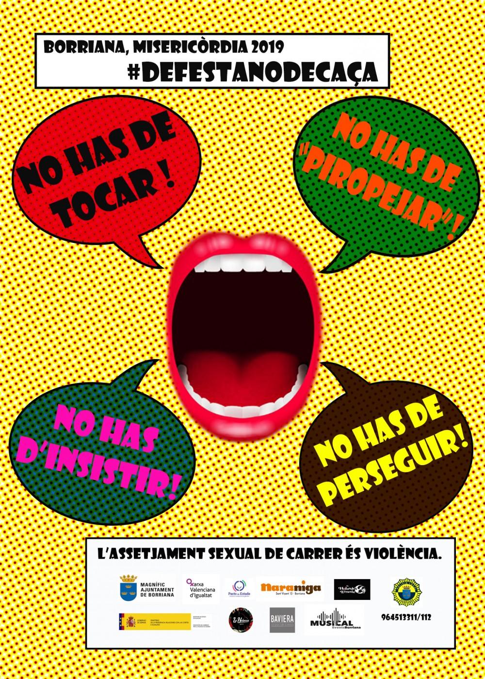 L'Ajuntament de Borriana ha llançat novament una campanya de prevenció d'agressions i assetjament sexual que amb el lema #defestanodecaça (i #defiestanodecaza), pretén anar un pas endavant en la lluita contra la violència de gènere i afavorir que les festes de la Misericòrdia siguen un espai en què homes i dones tinguen llibertat per a gaudir per igual, segons ha explicat la regidora d'Igualtat Maria Romero.