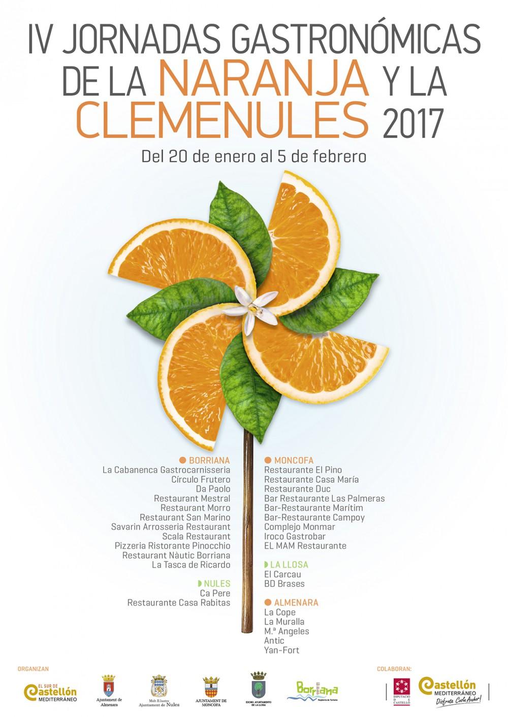 La concejalía de Turismo del Ayuntamiento de Borriana ha dado a conocer todos los detalles de la que ya es la octava edición de las 'Jornades Gastronòmiques de la Taronja i la Clemenules' que a partir del próximo fin de semana tendrán lugar en diferentes poblaciones que se encuentran englobadas dentro de la marca turística Castelló Sud. Tal y como ya se ha hecho en ocasiones anteriores, la celebración de las Jornadas se amplía a los municipios de Nules, Moncofa, La Llosa y Almenara, que tras la buena experiencia y los resultados de participación de otras ediciones, no han dudado en volver a proponer a sus establecimientos de restauración la elaboración de un menú especial para la celebración del certamen culinario.