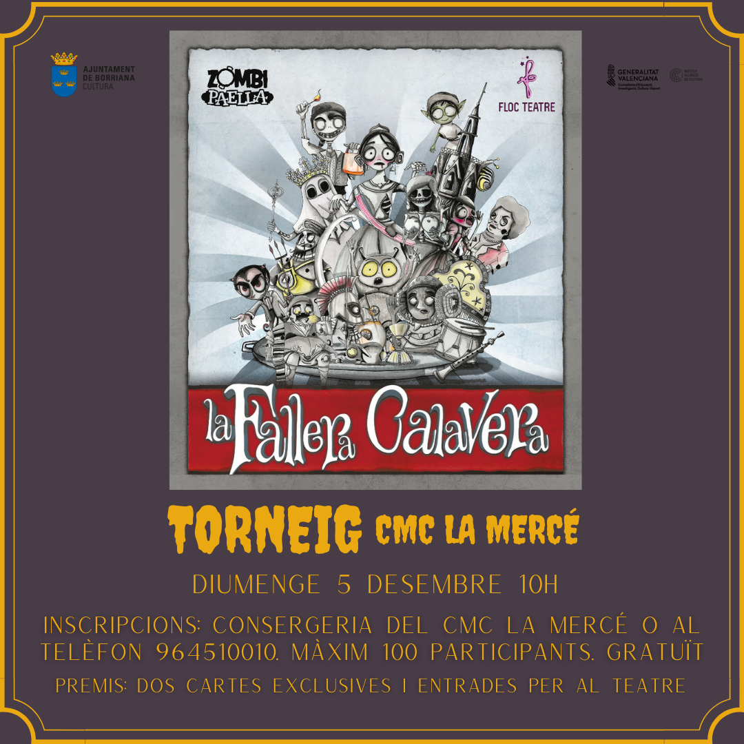 L'Ajuntament de Borriana ha obert el termini d'inscripció gratuïta per a participar en el torneig del joc de cartes La Fallera Calavera previst per a diumenge que ve, dia 5 de desembre, a les 10h al CMC la Mercè. La inscripció és limitada a cent participants per ordre d'arribada.