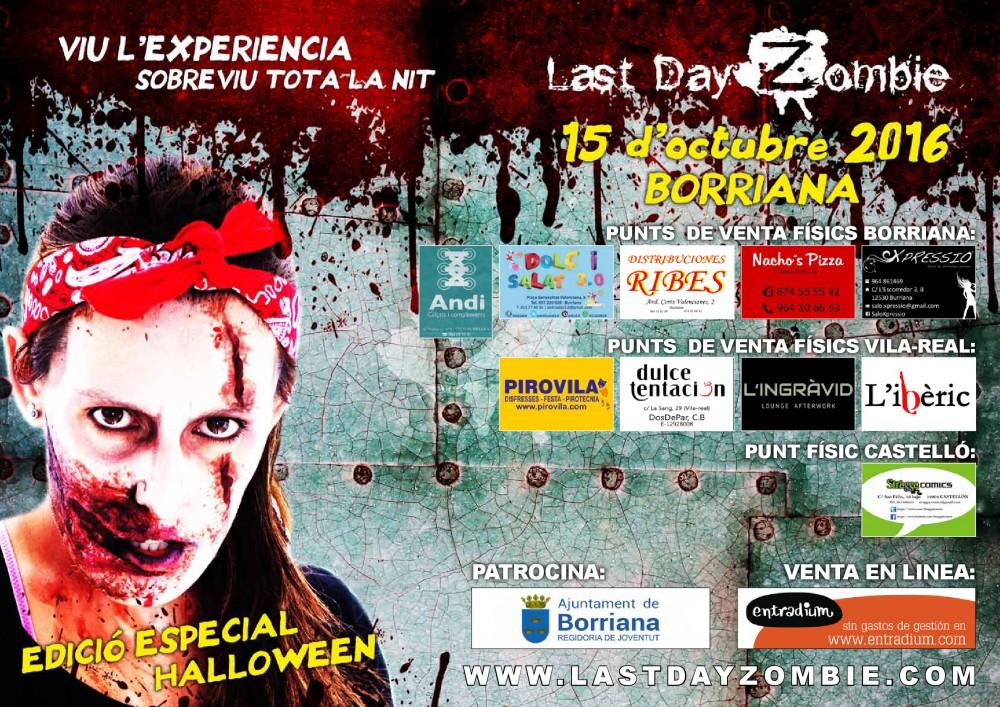 El proper dissabte 15 d'octubre arriba a Borriana un dels esdeveniments d'oci amb major participació amb el Last Zombie Day que tindrà lloc a partir de les onze de la nit en el conjunt de tot el cas urbà de la ciutat. Des de la regidoria de Festes de l'Ajuntament de Borriana que organitza l'acte lúdic, la seua máxima responsable, Lluïsa Monferrer, ha animat “a tots aquells que estiguen disposats a combinar l'entreteniment amb una dosi de por o d'intriga a inscriure's en la que serà la primera festa zombie que tindrà lloc a Borriana”. Els organitzadors de la festa que compten amb l'assessorament de l'empresa especialitzada Last Day Ocio Alternativo, han explicat alguns de detalls d'una nit que s'espera moguda a la ciutat. L'inici tindrà lloc a partir de les onze de la nit a la plaça José Iturbi, on l'escena inicial que planteja l'aparició d'un virus a la ciutat servirà com a tret d'eixida del recorregut que tots els equips hauran d'anar completant durant la nit. Així, el trajecte a través d'edificis, places i carrers de la ciutat portarà a cadascun dels equips a anar completant les més de vint proves plantejades pels organitzadors. Depenent del nombre d'inscrits els participants es dividiran en grups per tal de fer coincidir el nombre d'equips amb el de les proves existents, i així que tots i totes estiguen en acció constant completant una darrere de l'altra totes les proves.