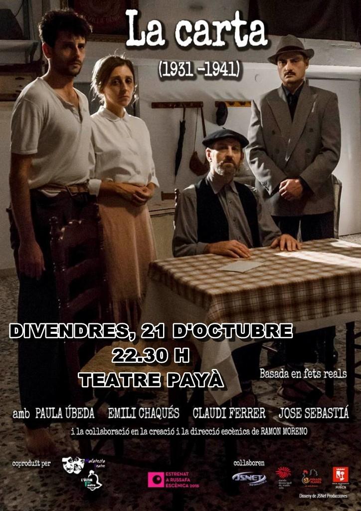 El Teatre Payà de Borriana rendirà un homenatge a la Memòria Històrica amb l'espectacle La Carta (1931-1941), un relat 'colpidor' basat en fets reals i que portarà als escenaris 'la foscor del franquisme' amb la coproducció de les companyies valencianes Malatesta i l´Últim Toc Teatre.