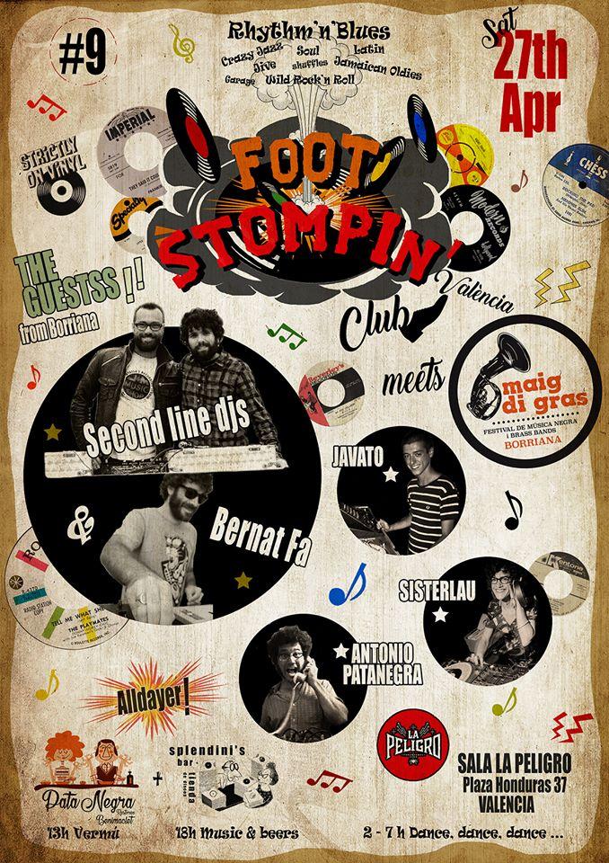 La segona de les cites arribarà a partir de les sis de la vesprada amb el «Music and beers» que acollirà el Splendini Bar i Discos, on de nou es podrà gaudir de les sessions tant de Second Line dj's com Bernat Fa, dues de les propostes que cada any també es poden gaudir en el Maig di Gras. I la jornada del dissabte es tancarà en «una de les sales que actualment són referent quant a música i a programacions mensuals com és La Perill, on es tancarà la col·laboració entre el Maig di Gras i Foot Stompin Club, ja que com han explicat des de l'organització del festival, "es tracta tant de donar a conèixer les propostes del festival que se celebrarà entre el 16 i 19 de maig, com d'anar teixint i acostant les relacions dels i les amants de la música i les brass-band, per a així continuar difonent aquest tipus de música en les terres valencianes i poder gaudir cada vegada més d'iniciatives culturals i musicals agermanades amb el Maig di Gras".