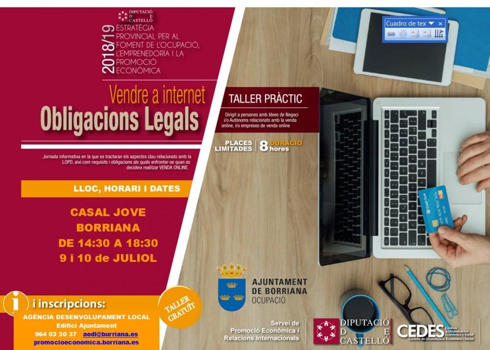 La regidoria de Promoció Econòmica de Borriana ha anunciat la celebració d'un nou taller destinat a persones emprenedores i comerciants en general, ja que estarà dedicat a totes les obligacions i també drets que aquests i aquestes tenen a l'hora de realitzar vendes dels seus productes a través d'Internet. Tal com ha explicat la regidora de l'àrea, Maria Romero, el taller tindrà lloc els pròxims 9 i 10 de juliol en el Casal Jove de Borriana, i per a realitzar les inscripcions tan sols cal dirigir-se a l'Agència d'Ocupació i Desenvolupament Local situada en l'Ajuntament de Borriana o emplenar la sol·licitud a través del següent enllaç: https://goo.gl/forms/WWJtsMIewdWgRpqy2 .