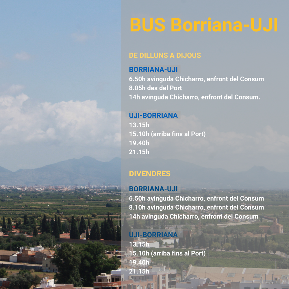El bus eixirà de Borriana a les 6.50h, 8.05h i 14h, i passarà per Almassora a les 7.10h, 8.30h i 14.20h. El trajecte fins a l'UJI durarà al voltant de 40 minuts. Hi haurà un autobús directe a l'UJI des del Port de Borriana que eixirà a les 8.05h per a donar servei a l'alumnat resident en la zona marítima, i realitzarà totes les parades de Borriana, fins a l'UJI sense passar per Almassora. Per a tornar de l'UJI, el bus amb parada al port de Borriana, eixirà a les 15.10h.