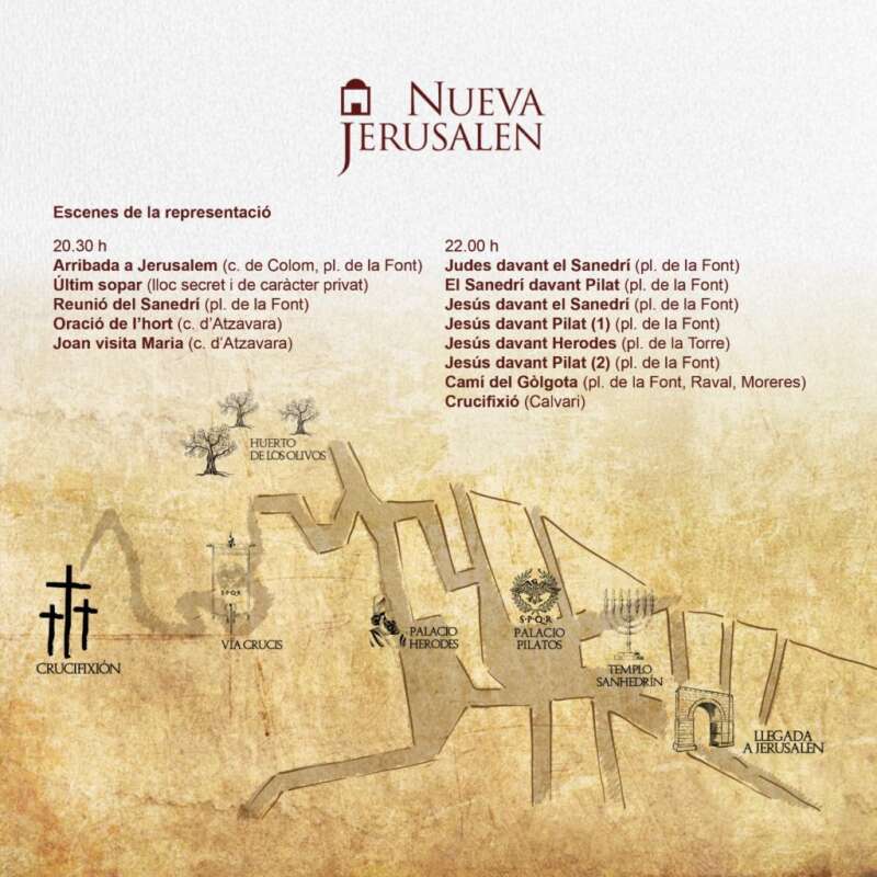 La representación comenzará a las 20.30 horas con las escenas de la llegada a Jerusalén; a las 22 horas continuará con las vivencias de los últimos momentos de la vida de Jesús de Nazaret y recorrerá diferentes espacios del municipio hasta culminar en el Calvario con las escenas de la Crucifixión y el Descendimiento.