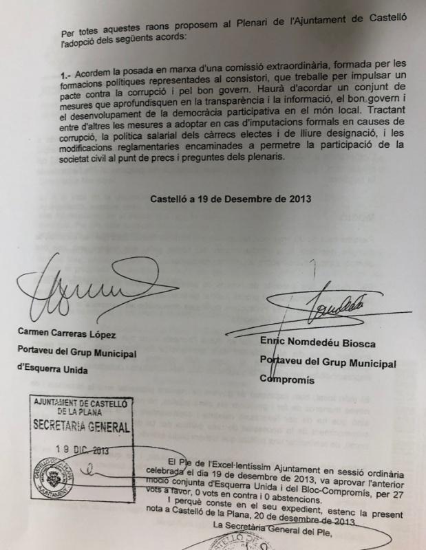 “Acordem la posada en marxa d’una comissio extraordinaria formada per les formacions polítiques representades al consistori, que treballe per impulsar un pacte contra la corrupción y pel bon govern. Haurá d’acordar un conjunt de mesures que aprofundisquen en la transparencia i la información, el bon govern iel desenvolupament de la democracia participativa en el món local. Tractant entre d’altres les mesures a adoptar en cas d’imputacions formal en causes de corrupción, la política salarial dels càrrecs electes de lliure designació, i les modificacions reglamentàries encaminades a permetre la participación de la societat civil a punt de precs i preguntes dels plenaris”.