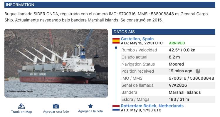 El Sider Onda atracó el 16 de mayo procedente de Rotterdam y su destino era el puerto de Egipto