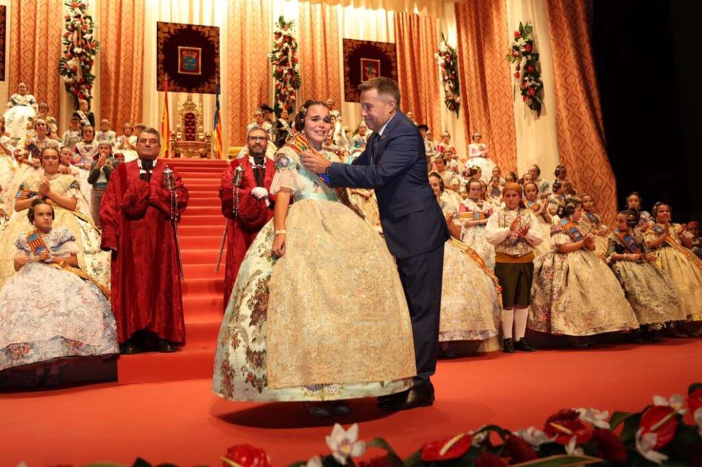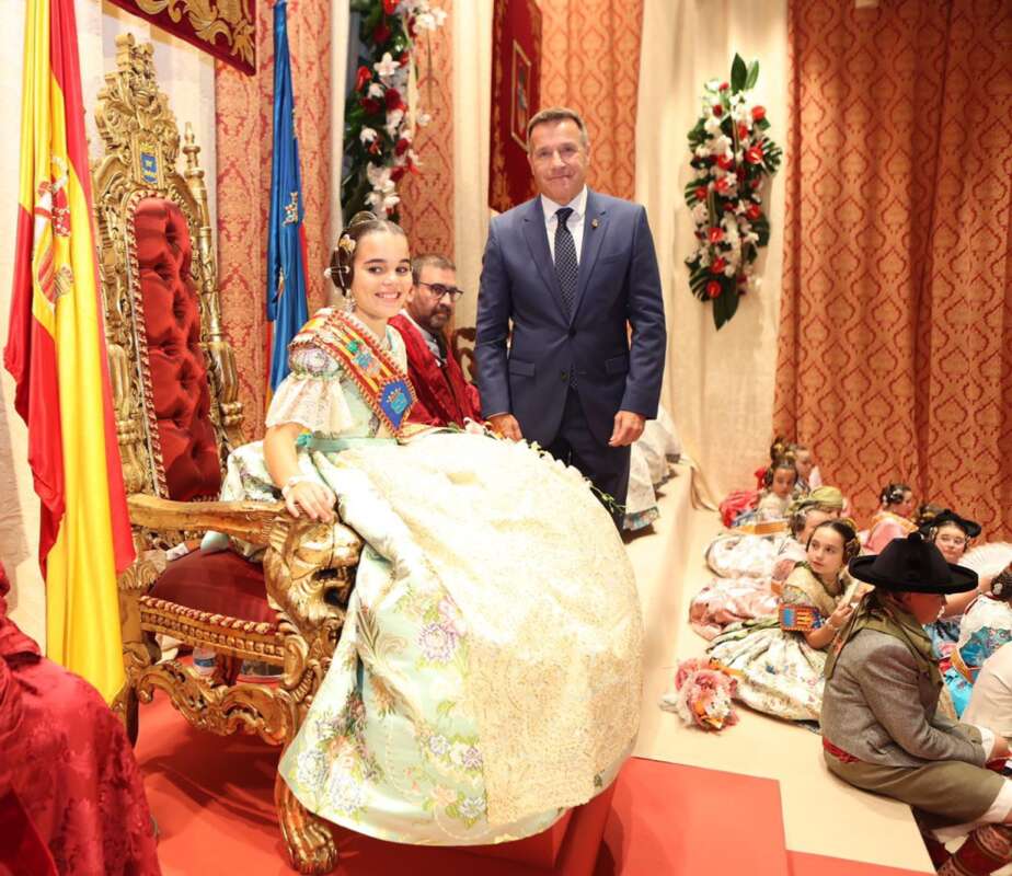 Anna Solà ha rebut la banda de máxima representant infantil de Burriana 2024 a mans de l'alcalde, Jorge Monferrer Daudí, juntament amb la Cort d'Honor i Dames de la Ciutat 2024 i les falleres de les 18 comissions de falles del municipi.