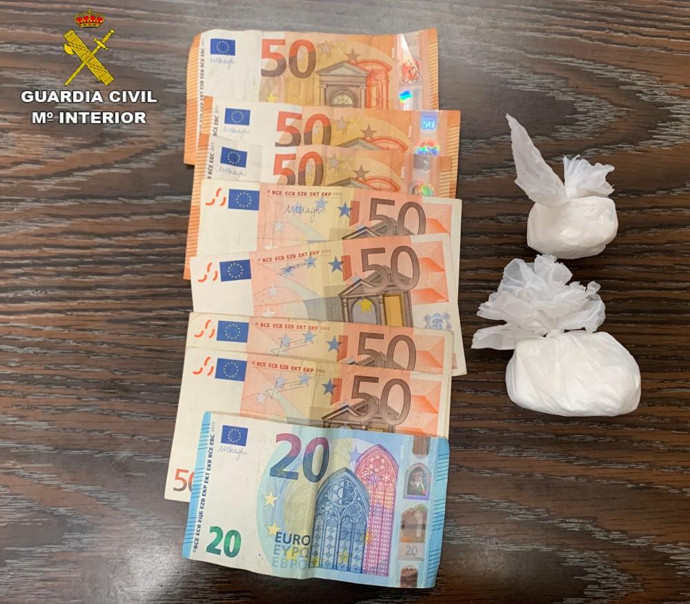 Los guardias civiles encontraron también ocultos 370 euros repartidos en diferentes billetes empleados posiblemente en la compra y venta de la cocaína.