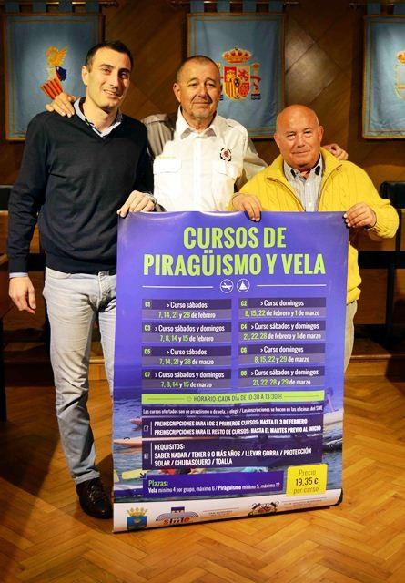 El concejal de Deportes de Burriana, Juan Fuster; acompañado por el presidente del Club Náutico, Ximo Feliu y el vocal social de la entidad, José Luis Agustí, ha presentado hoy los cursos de vela y piragua que organizan conjuntamente el Servei Municipal d’Esports y el club.