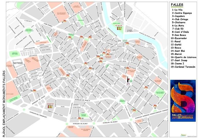 La Concejalía de Turismo de Burriana, que dirige Belén Sierra, ha elaborado un plano con la ubicación de las 19 fallas que se plantan en la localidad. De esta manera se facilita la ubicación de los monumentos falleros a las muchas personas que durante los próximos días se desplazarán a la localidad para contemplar los monumentos y vivir loas fallas. Está disponible en PDF en www.burriana.es junto con el programa de actos oficiales y en el enlace http://www.burriana.es/images/stories/pdf/portada/2014-PlanolFalles.pdf
