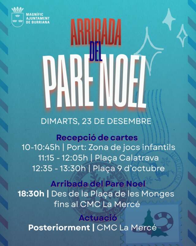 L'Ajuntament de Burriana ha organitzat una completa programació per a celebrar l'arribada de Pare Noel a la ciutat, una de les cites més esperades del Nadal, pensada per al gaudi de les famílies i, especialment, dels més menuts.