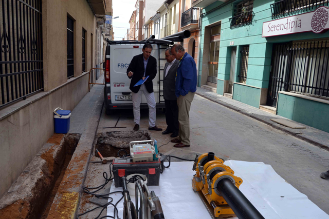 El Ayuntamiento de Burriana finalizará a mediados del próximo mes de junio las obras de renovación de la red de agua potable en la calle San Victoriano, que se enmarcan en la decimosexta fase del Plan de Mejora de Infraestructuras Hidráulicas de la ciudad y que servirán para completar un sector hidrométrico en el que también se incluyen las calles Tarancón, l’Escorredor, Ausiàs March y la Tanda. El alcalde de la ciudad, José Ramón Calpe y el concejal de Vía Pública, Javier Perelló, han supervisado esta mañana las obras, acompañados por el ingeniero y delegado de Facsa en Burriana, Rafael Lahuerta, quien les ha explicado las características de la actuación. La renovación de la red en San Victoriano ha supuesto la anulación de la única tubería de fibrocemento existente bajo la calzada y la instalación de otras dos, una por debajo de cada acera, de 110 y 160 milímetros de diámetro. Asimismo, se han renovado las acometidas domiciliarias con materiales más duraderos y el consistorio ha aprovechado para ampliar las aceras, que pasan de 90 a 150 centímetros de anchura y que cuentan ahora con nuevas rampas accesibles con pavimento especial antideslizante.