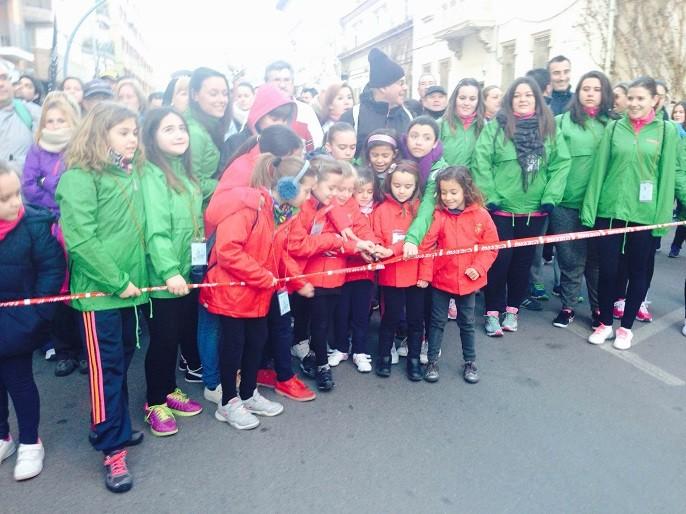 Les falleres de Don Bosco -junt al president infantil, les reines de Borriana, Alejandra Guardino i Carmen Doménech, i les seues corts d'honor; i l'alcalde, José Ramón Calpe- han tallat la cinta que ha donat eixida este matí a la XVI Volta a peu a les ermites, en la que participen enguany 784 persones.