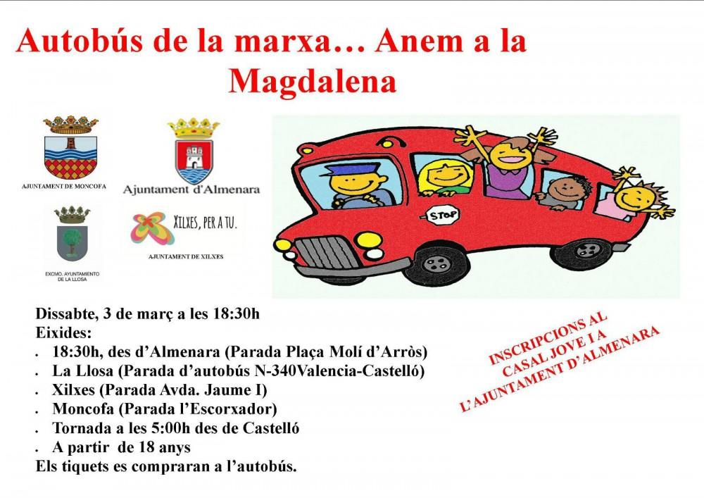 Els ajuntaments d'Almenara, la Llosa, Xilxes i Moncofa de manera conjunta oferiran als seus respectius veïns la possibilitat d'anar el dissabte 3 de març a les festes de la Magdalena de Castelló amb autobús sota la iniciativa anomenada "Autobús de la marxa...anem a la Magdalena". Segons ha destacat la regidora de joventut d'Almenara, Terebel Galiano, "gràcies a la col·laboració dels quatre ajuntaments anem a prestar als nostres veïns i veïnes un servei perquè puguen acudir a les festes de la Magdalena a gaudir sense haver d'agafar el cotxe particular".
