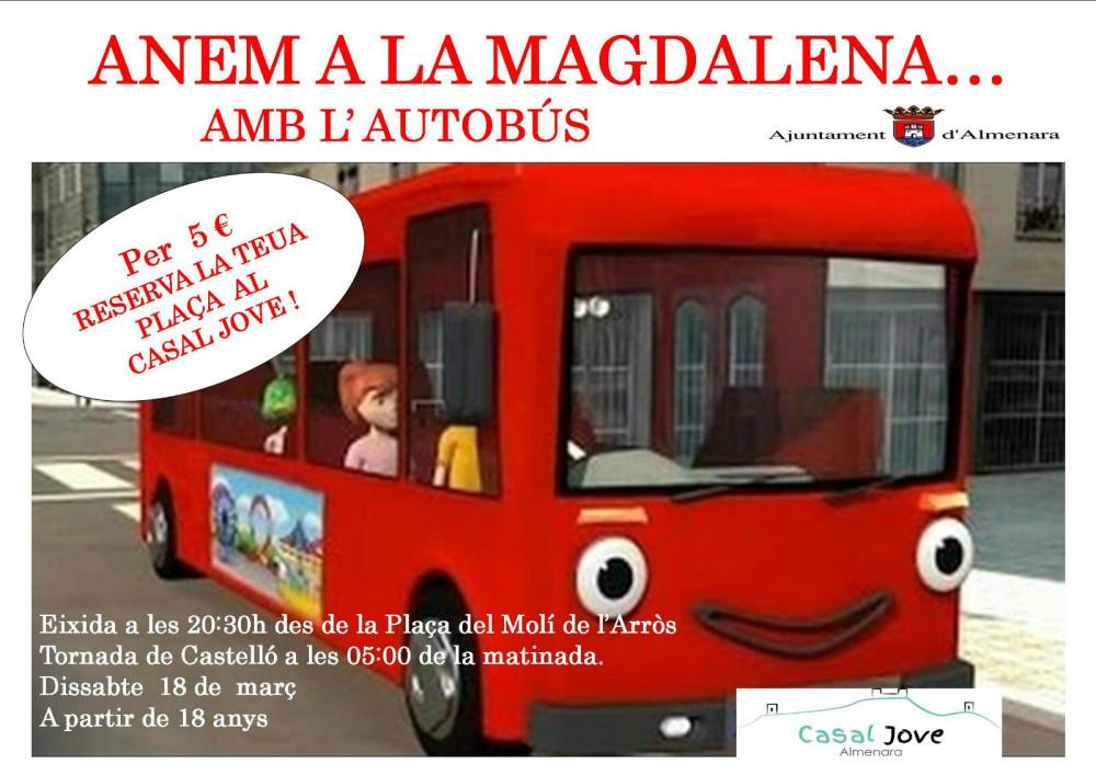 del Casal Jove posarà un servei d'autobús per a connectar la localitat amb Castelló el denominat dissabte de Magdalena, que coincidirà amb el 18 de març, amb l'objectiu de facilitar un transport segur als veïns i veïnes de la localitat. La regidora de Joventut, Terebel Galiano, ha destacat que "tal com vam fer el passat any, tornem a apostar per posar aquest autobús per a facilitar la visita d'una manera segura i tranquil per a evitar que s'hagen d'agafar els cotxes, doncs no comptem amb uns horaris i servei de tren alternatiu" doncs "cada vegada és major la tradició d'anar el primer dissabte de Festes de la Magdalena a Castelló, tant pels joves com els no tan joves".