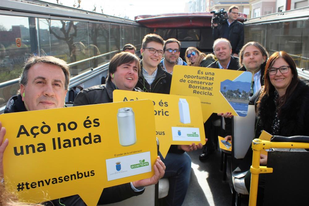 Los representantes municipales del Ayuntamiento de Borriana y la prensa que cubre la actualidad municipal se han subido hoy al bus que durante la próxima semana realizará hasta ocho visitas turísticas cada día por los puntos más emblemáticos de la ciudad de Borriana, dentro de la campaña 'Te'n vas en Bus' que Ecoembes y el consistorio han iniciado con la llegada de 2017. Se trata de una campaña de concienciación ciudadana en la que la empresa de gestión de residuos urbanos y el Ayuntamiento pretenden a través de una iniciativa pionera como esta aumentar “la colaboración de todos los ciudadanos, ya que es vital para favorecer el cuidado del entorno. Es por ello que en Ecoembes y en colaboración con la concejalía de Medio Ambiente desarrollamos este tipo de campañas para concienciar de la importancia que tiene la separación de envases para el medio ambiente, ya que es un gesto que ayuda a conseguir un futuro más sostenible”, tal y como explicaba el responsable de la campaña para Ecoembes, Juan Alonso.