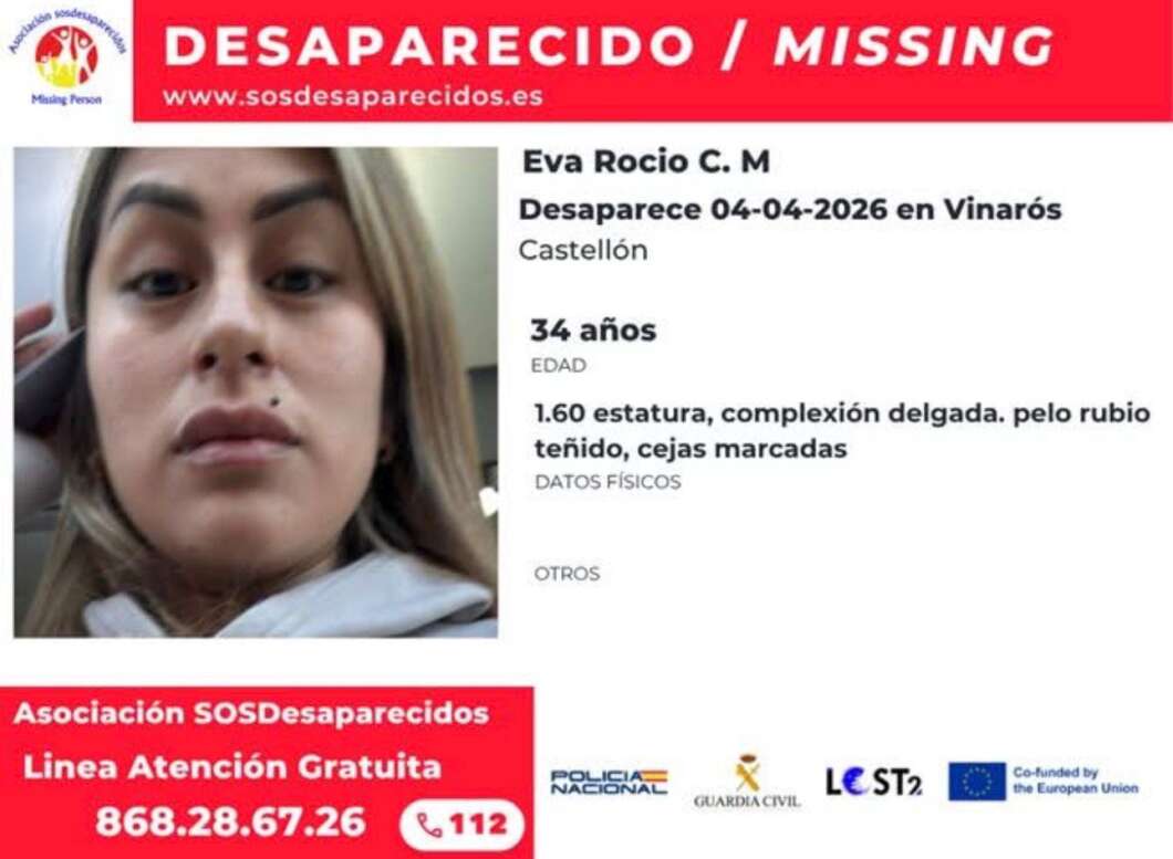 La asociación SOS Desaparecidos ha lanzado una alerta ciudadana para localizar a Eva Rocío C. M., una mujer de 34 años desaparecida en la localidad de Vinaròs el pasado 4 de abril.