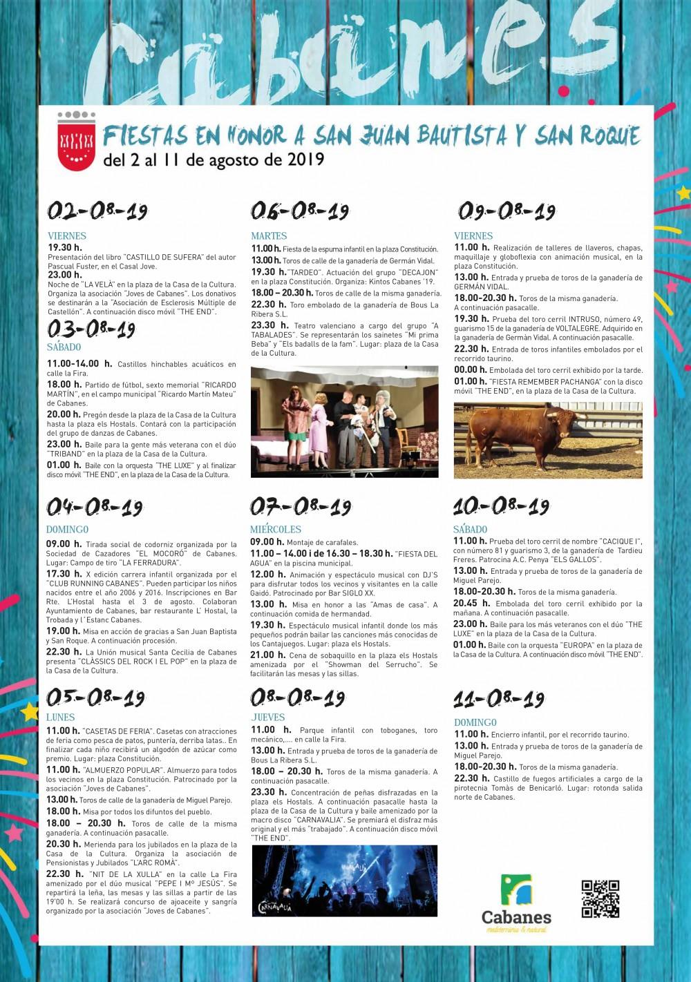 La localitat castellonenca de Cabanes celebrarà les Festes en honor a Sant Joan Baptista i Sant Roc del 2 al 11 d'agost amb una gran varietat d'activitats dirigides a tots els públics.