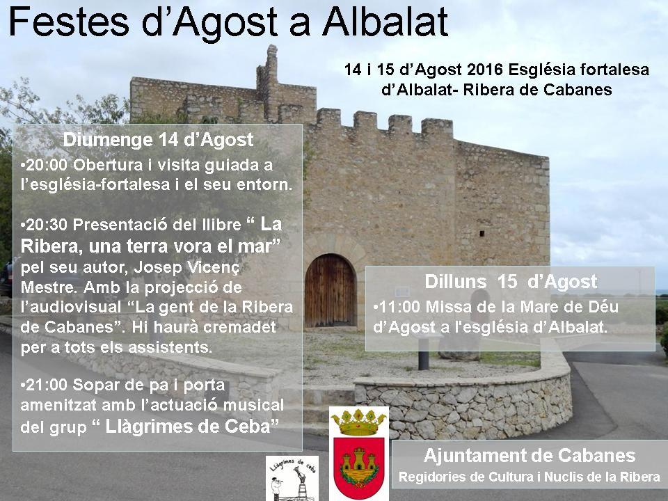 El diumenge 14 a partir de les 20:00 s'obrirà l'església fortalesa, un edifici que per si sòl paga la pena visitar per tractar-se d'un element únic en el nostre territori. Acte seguit, es farà la presentació del llibre " La Ribera, una terra vora el mar" de Josep-Vicenç Mestre, un espectacular treball de recopilació del noms, malnoms, toponímia local dels nuclis de la Ribera; les seues partides, masos, indrets, famílies... un repàs d'anècdotes contades pels seus propis protagonistes de la vida de postguerra, il·lustrat amb centenars de fotografies que l'autor ha anat recopilant.