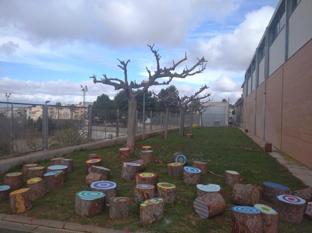 El municipio ha aportado troncos de árbol ya cortados. Éstos servirán como asientos para poder realizar clases al aire libre. Los alumnos de IES se han encargado de decorarlos y pintarlos.