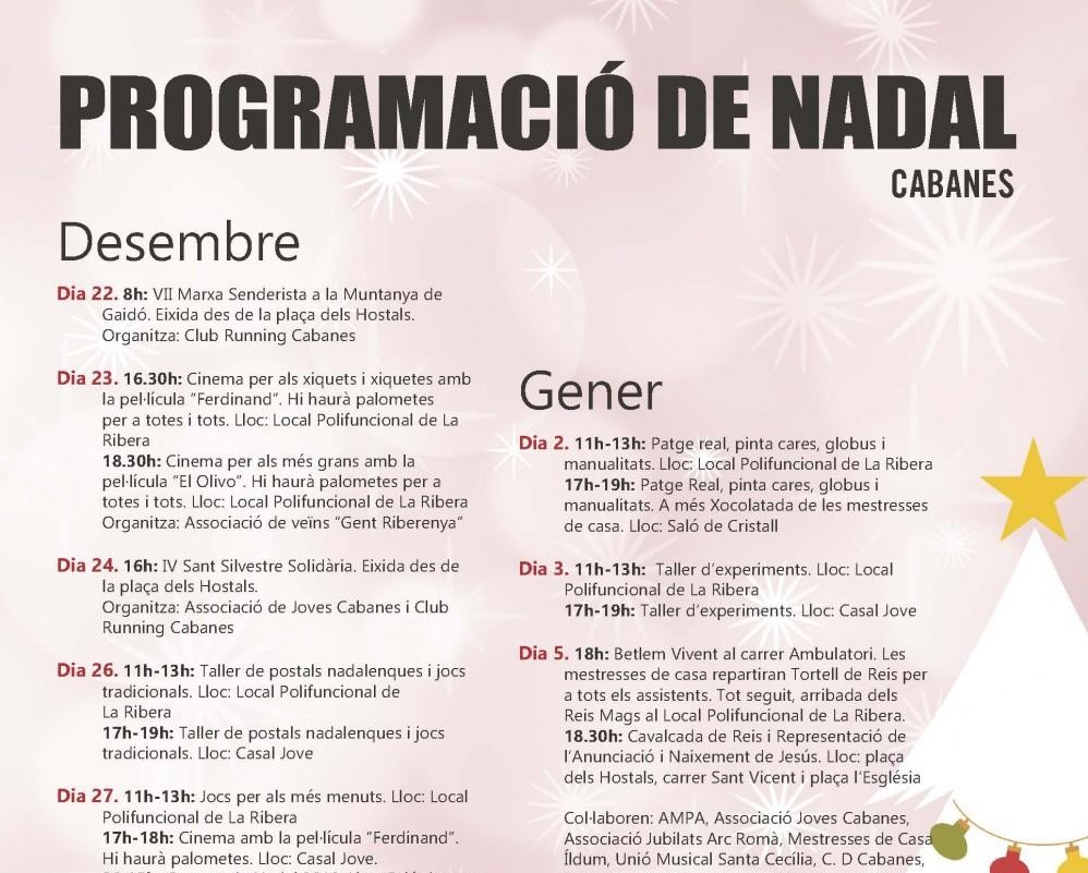 Des del proper diumenge 22 de desembre i fins al 5 de gener, Cabanes viurà unes intenses jornades d'activitats infantils, esportives i culturals. L'Ajuntament ha coordinat una programació que compta amb la col·laboració de nombroses entitats i veïns del poble.